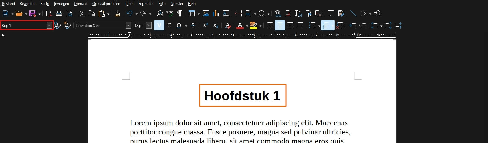 We gaan in LibreOffice de hoofdstuktitels aan een stijl toewijzen, zodat we daarna een inhoudsopgave kunnen genereren. Dit document bevat een dummytekst, zodat het makkelijker wordt om het resultaat te zien van de aanpassingen die we uitvoeren.