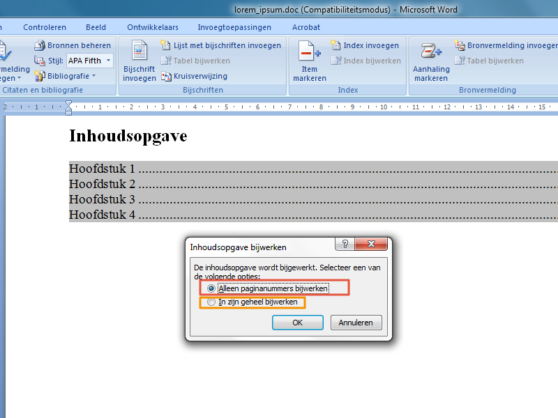 Als u voor de tweede optie kiest, gaat het programma opnieuw alle ‘kop 1’-stijlen zoeken. Heeft u nieuwe hoofdstuktitels toegevoegd, dan worden deze automatisch in de inhoudsopgave geplaatst.