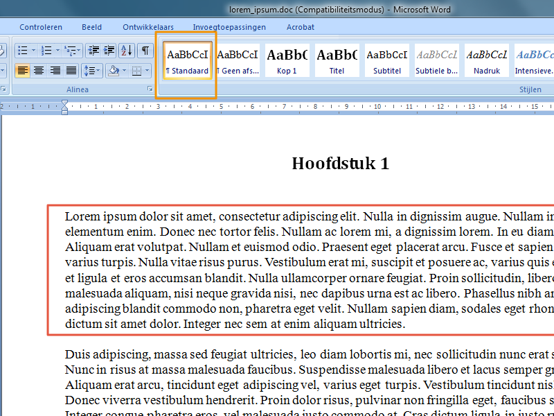 We gaan in Office 2007 de hoofdstuktitels aan een stijl toewijzen, zodat we deze later aan de inhoudsopgave kunnen toevoegen. Dit document bevat een dummytekst, zodat het makkelijker wordt om het resultaat te zien van de aanpassingen die we nu gaan uitvoeren.